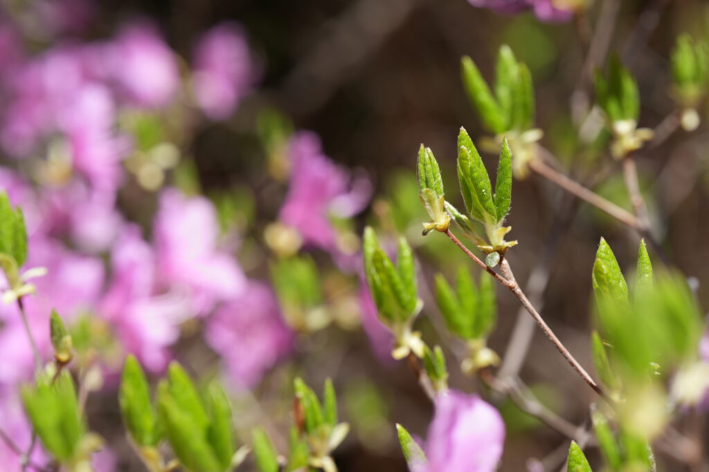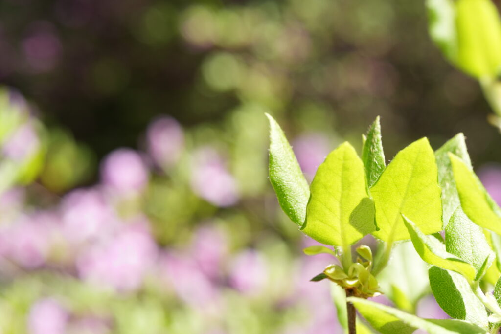 花の後(または同時に)枝先に小ぶりの葉を3枚つけます。小さい葉が3枚なので「小葉の三つ葉ツツジ」です。