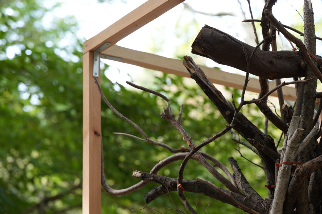 この作品は神戸六甲ミーツ·アートのこどもプログラム作品で、子供たちが木枝をひとつずつ当てはめ、狙いと偶然が交わりながら、ひとつの大きな作品が作られます。ワークショップごとに作品は増え、経過とともに変化し続けるアートとのこと。