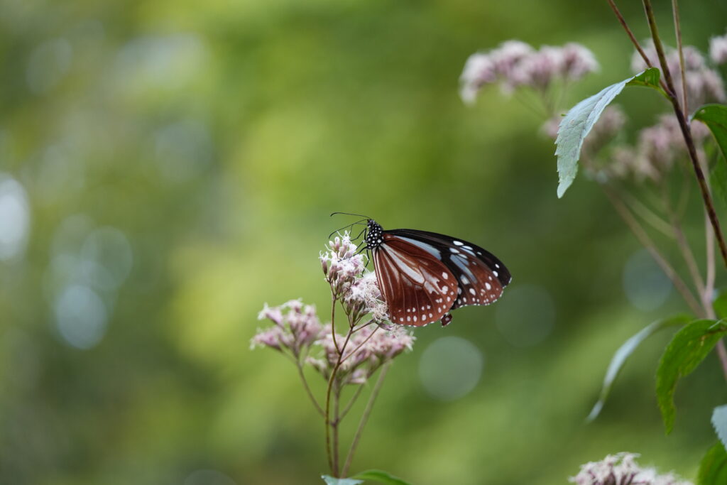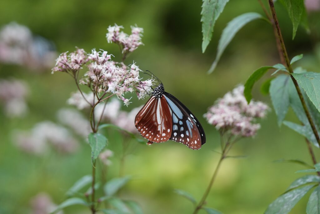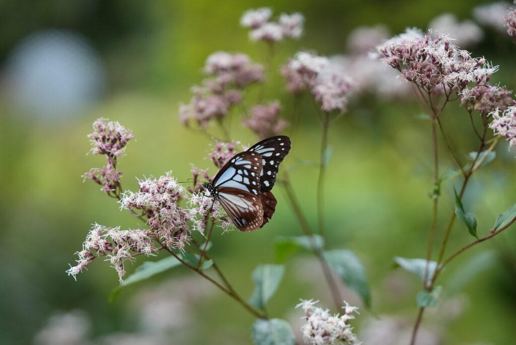 アサギマダラは、日本産のチョウで唯一渡りをする種で、直線距離で1,500km移動した記録もあるそうです。秋にフジバカマの花の蜜を吸うために集まってきます。フジバカマはアサギマダラにとって重要な蜜源植物。近年では野生種が減少していて、保護活動が行われているそうです。