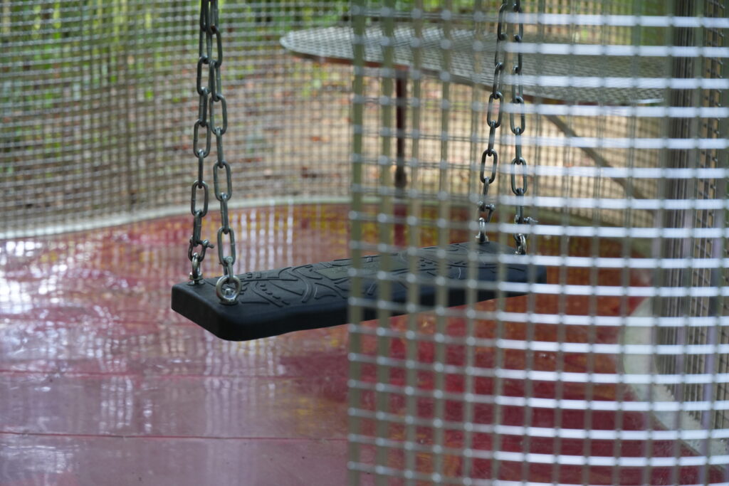 中に入って休憩できる大きな鳥カゴのようなパビリオンと、その前にはブロワーを持って清掃作業をする労働者の彫刻があります。何を語りかけているのでしょうか。