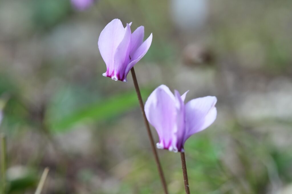 原種のシクラメン。お花屋さんでよく鉢植えで売ってる華やかな園芸品種のものとくらべると小さめで華奢。うつむき加減で奥ゆかしく咲いています。