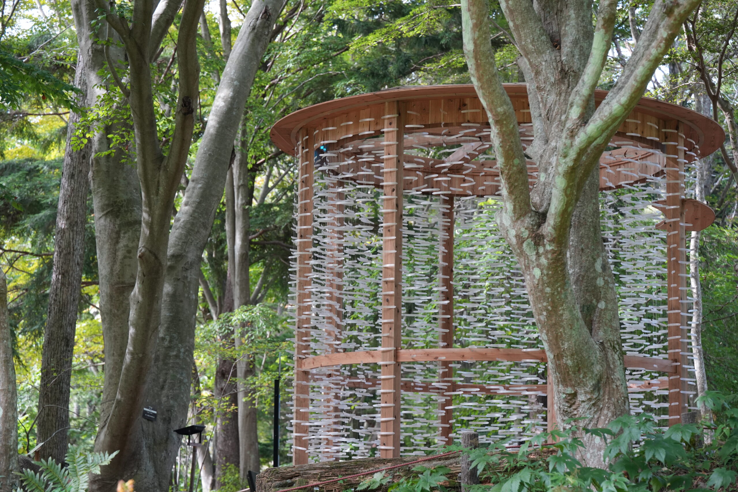 この作品は神戸六甲ミーツ·アートのこどもプログラム作品で、子供たちが木枝をひとつずつ当てはめ、狙いと偶然が交わりながら、ひとつの大きな作品が作られます。ワークショップごとに作品は増え、経過とともに変化し続けるアートとのこと。