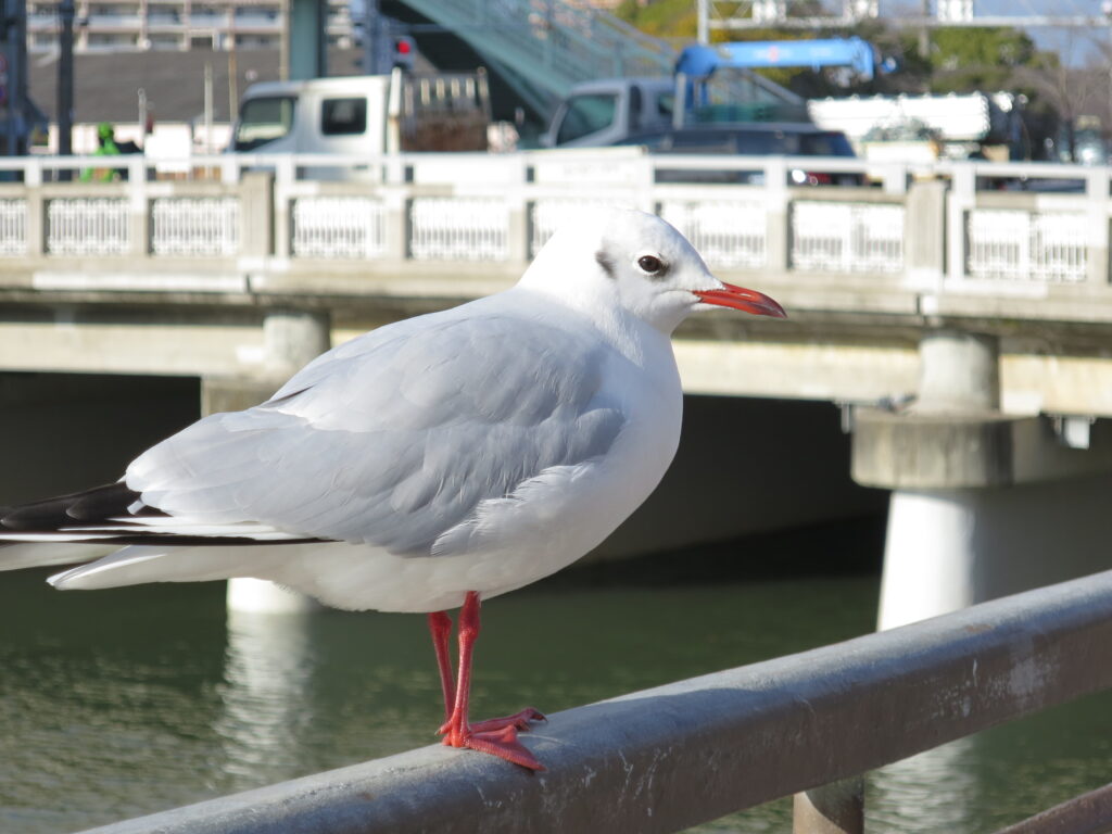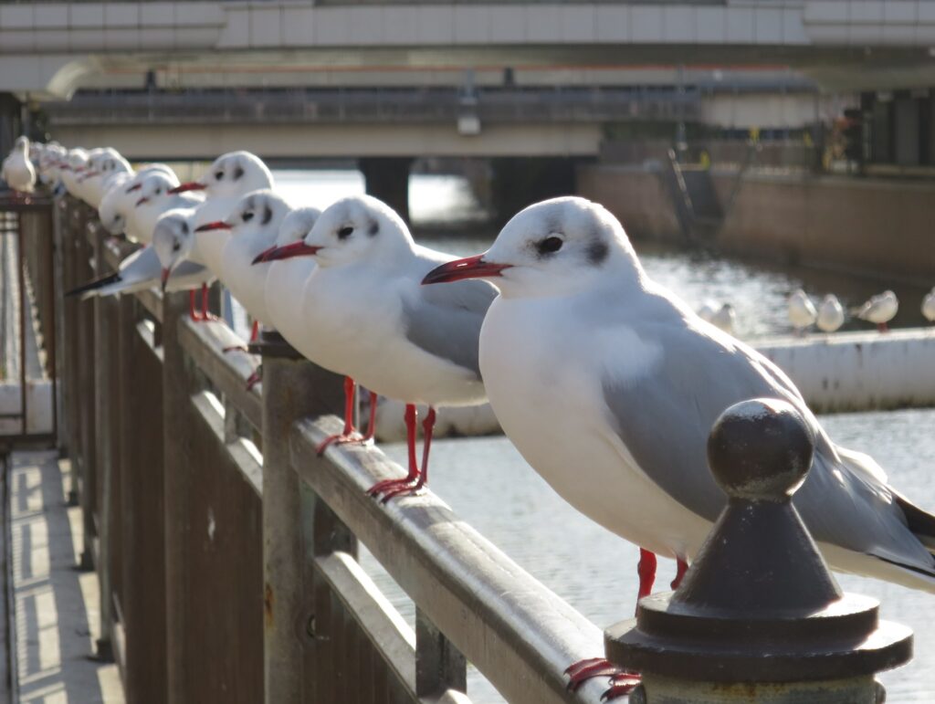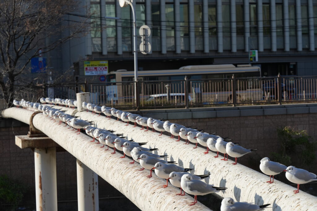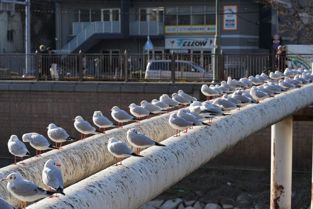 川沿いの手すりや、川の上に渡されたパイプの上に、ズラ〜と等間隔で並ぶ姿は、冬の風物詩となっています。ユリカモメたちが来るようになると「ああ、冬が来たな」と感じさせられます。